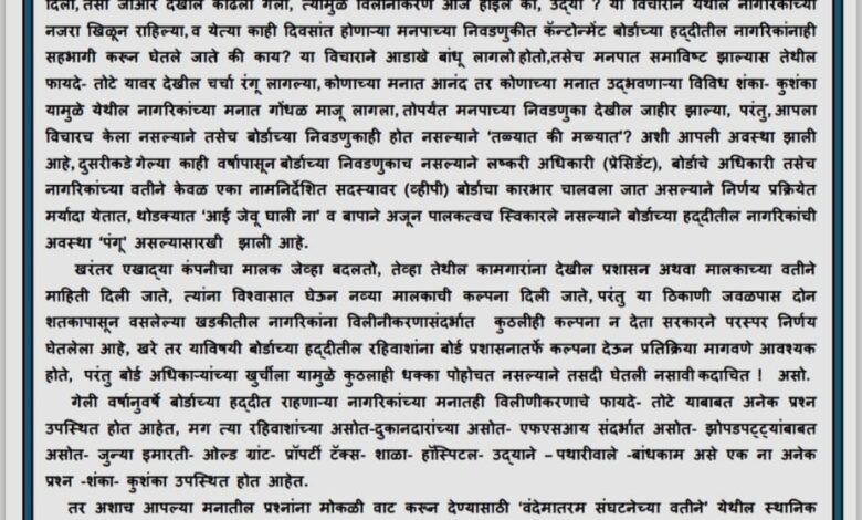 पुणे : दि. १४. खडकी कॅन्टोन्मेंट बोर्ड – पुणे महानगर पालिकेत विलीनीकरण संदर्भात खडकीतील नागरिकांच्यासाठी खुले चर्चा सत्राचे आयोजन खडकीतील वंदेमातरम संघटनेच्या वतीने शनिवार दिनांक २९ नोव्हेंबर २०२५ रोजी दुपारी ०४:०० वाजता करण्यात येणार आहे यासाठी वंदेमातरम संघटनेने खडकीकरांना विनम्र आवाहन केले आहे. देशातील कॅन्टोन्मेंट बोर्डांना जवळच्या महानगरपालिका, नगरपालिका अथवा नगरपरिषदांमध्ये विलीनीकरण करण्याचा निर्णय केंद्र सरकारने घेतला आहे. त्याअनुषंगाने पुण्यातील खडकी कॅन्टोन्मेंट बोर्ड व पुणे कॅन्टोन्मेंट बोर्डाचे पुणे मनपात विलीनिकरण करण्याच्या प्रक्रियेस गेल्या सहा महिन्यांपूर्वी महाराष्ट्र शासनाने मान्यता दिली होती. व तसा शासनाकडून जीआर देखील काढला गेला होता. पण विलीनीकरण आज होईल की, उद्या ? या विचाराने खडकीतील नागरिकांच्या नजरा लागून राहिल्या आहे. व येत्या काही दिवसांत होणाऱ्या मनपाच्या निवडणुकीत कॅन्टोन्मेंट बोर्डाच्या हद्दीतील नागरिकांनाही सहभागी करून घेतले जाते की काय? या विचाराने आडाखे कार्यकर्ते बांधू लागले आहे. तसेच पुणे महानगर पालिकेत समाविष्ट झाल्यास तेथील फायदे- तोटे यावर देखील चर्चा रंगू लागल्या आहे. कोणाच्या मनात आनंद तर कोणाच्या मनात उद्भवणाऱ्या विविध विचार, शंका- कुशंका यामुळे येथील नागरिकांच्या मनात गोंधळ माजू लागला आहे. जशा पुणे महानगर पालिका निवडणूक जाहीर झाल्याने खडकीचा विचारच केला नसल्याने तसेच बोर्डाच्या निवडणुकाही होत नसल्याने कार्यकर्ते ‘तळ्यात की मळ्यात’? अशी अवस्था झाली आहे. दुसरीकडे गेल्या काही वर्षापासून बोर्डाच्या निवडणुकाच नसल्याने लष्करी अधिकारी (अध्यक्ष), बोर्डाचे अधिकारी तसेच नागरिकांच्या वतीने केवळ एका नामनिर्देशित सदस्यावर (उपाधयक्ष) बोर्डाचा कारभार चालवत आहे. यामुळे निर्णय प्रक्रियेतमध्ये मर्यादा येत आहेत. थोडक्यात ‘आई जेवू घाली ना’ व बापाने अजून पालकत्वच स्विकारेना अशी खडकी कॅन्टोन्मेंट बोर्डाच्या हद्दीतील नागरिकांची अवस्था असल्यासारखी झाली आहे.